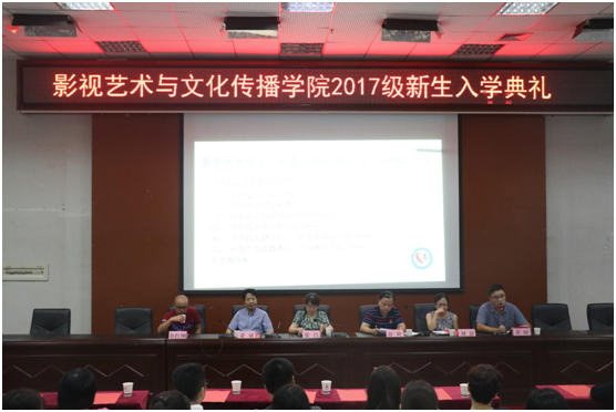 9月11日下午,影视艺术与文化传播学院2017级新生开学典礼在学术报告厅隆重举行。院长张吕、党总支书记舒欣、副院长荣斌、党总支副书记刘静、各教研室主任、新生班主任以及各年级辅导员出席了此次典礼。开学典礼由舒欣书记主持。