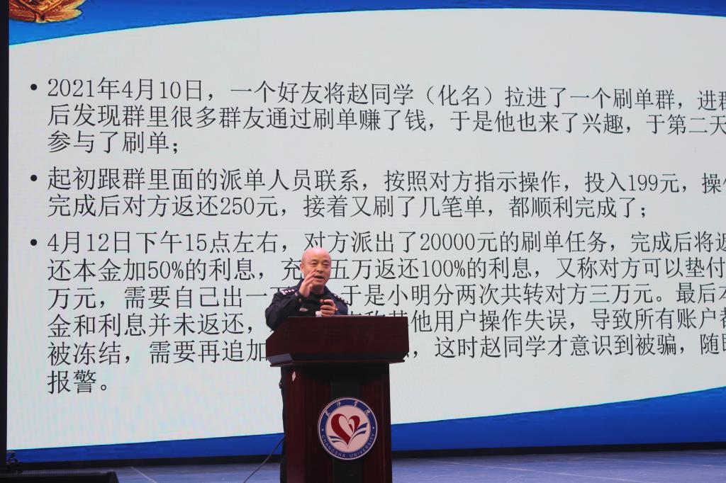 报告会由洪山桥派出所王文胜警官主讲。王警官总结了电信诈骗“广、快、新、专业”四大特点,强调了当前防范电信诈骗的必要性和紧迫性。他结合发生在我校学生相关案例,通过分析网络兼职刷单返利诈骗、冒充电商物流客服退款诈骗、冒充熟人诈骗等10余种电信诈骗类型,为同学们剖析骗局陷阱,传授防范电信诈骗技巧。“任你骗术怎么变,我不转账应万变”,王警官提醒同学们,“要杜绝贪利心理、严防身份信息泄漏、多积累防诈骗知识”。
