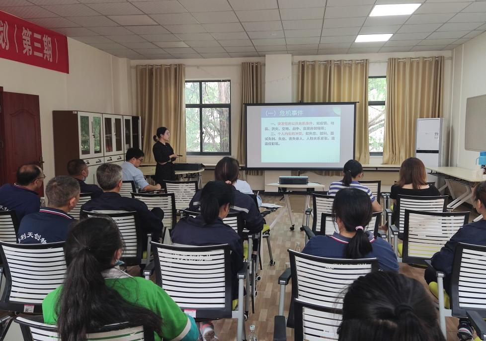 毛惠梨老师从心理危机、危机识别和干预、宿管人员的自我关怀三方面展开,重点阐明了心理危机的定义、类型以及如何对危机学生如何从言语、情绪、行为上进行症状识别。并通过举例、场景还原等方式对与会人员进行危机知识科普,对如何预防心理危机、如何初步处置危机事件、如何上报等方面进行了深入浅出的讲解。最后提醒园区宿管员进行自我关怀,提升心理能量。
