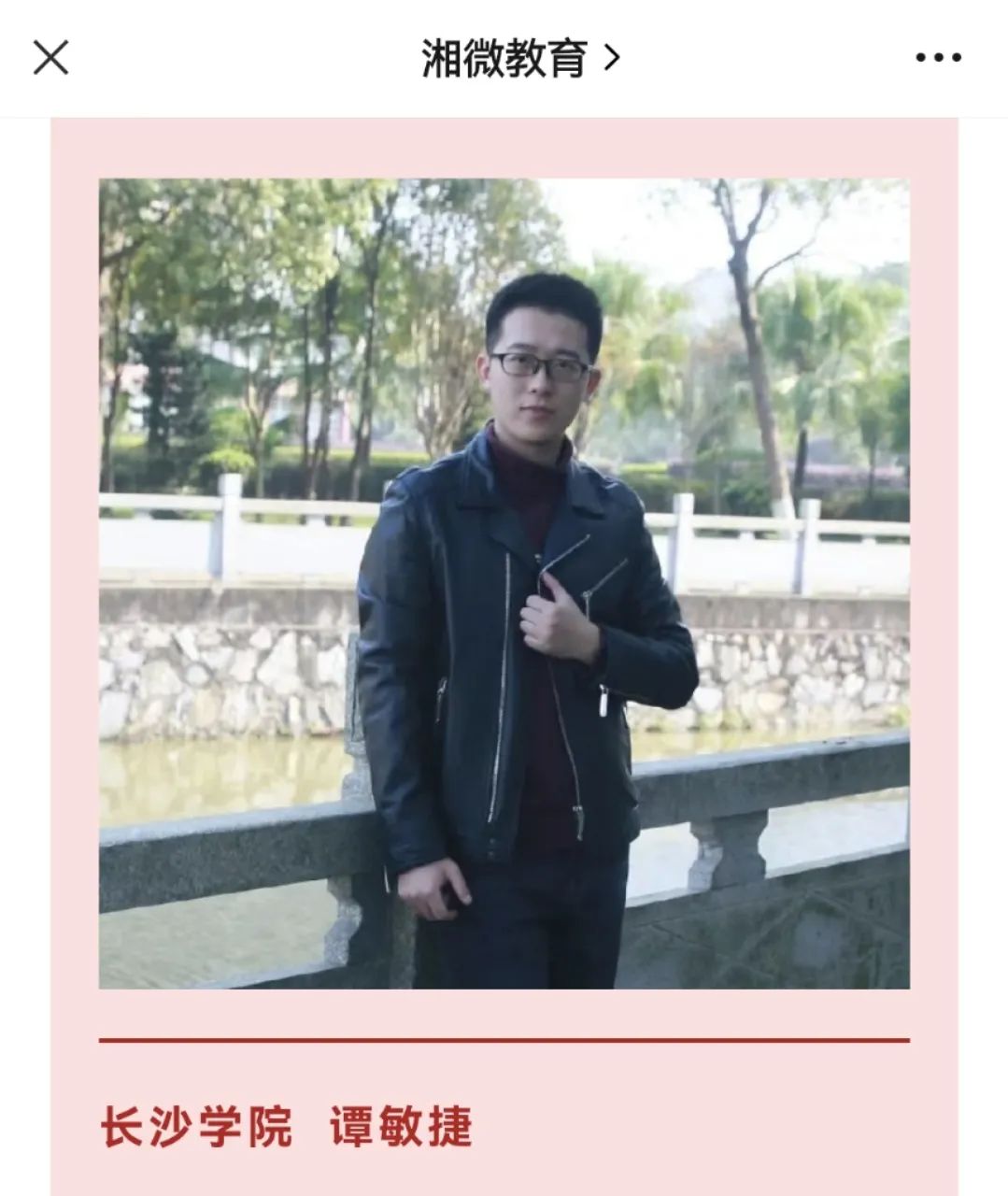 捷哥——我校经管学院辅导员谭敏捷,获湖南省第八届辅导员素质能力大赛初赛“冠军奖”及决赛“特等奖”、湖南省第九届辅导员素质能力大赛初赛“冠军奖”、湖南省高校学生思想政治教育研究与实践先进个人,事迹被湖南省教育厅官微“湘微教育”、“湖南省高校网络思想政治工作中心”官微报道。