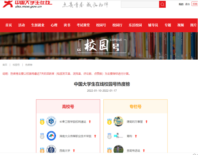 多次在“教育部中国大学生在线”专栏号热度榜排名第1