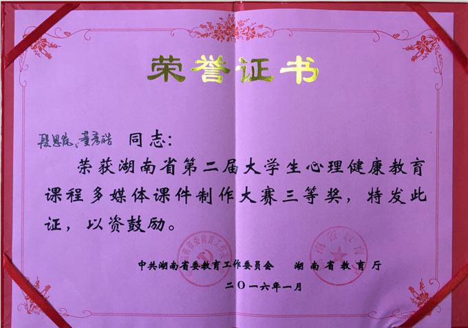 湖南省第二届大学生心理健康教育课程多媒体课件制作大赛由湖南省教育厅主办,湘潭大学协办。本届大赛共有来自全省65所高校的133个课件参赛,经过初评和盲评,27个作品进入决赛,最后根据初赛和决赛的总成绩(初赛盲评分占30%、决赛盲评分占30%、现场讲解分占40%)从高到低排名,共决出一等奖3名,二等奖6名,三等奖9名。