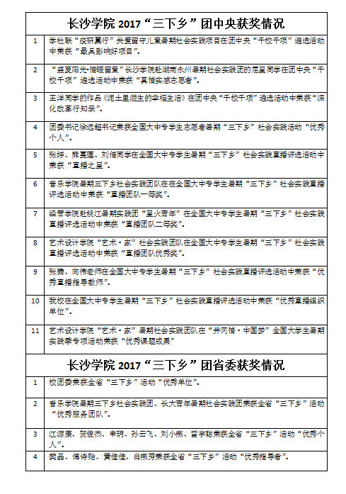 近日,2017年全省大中专学生志愿者暑期“三下乡”社会实践活动评选结果揭晓,校团委在“三下乡”暑期社会实践活动中获 “优秀单位”荣誉称号,长大青年暑期社会实践团、音乐学院暑期三下乡社会实践团获省级“三下乡”优秀服务团队表彰,贺俊杰、孙云飞等6人获省级“优秀个人”表彰,樊晶等4位团队指导老师获得 “优秀指导者”荣誉称号。