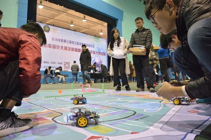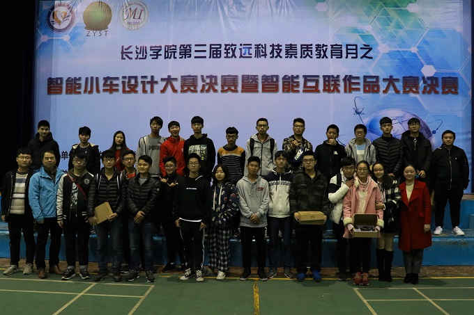 在微缩版长大地图上,一辆辆小车飞快地行驶着,试图把彩球推入远方的球门,一旁的观众屏息凝视……12月5日晚,我校第三届致远科技素质教育月之智能小车设计大赛决赛暨智能互联作品大赛决赛在永康体育馆举行。校党委委员甄洁洪亲临现场为选手加油打气,比赛吸引了湖南教育电视台、湖南日报、长沙晚报等多家主流媒体采访报道。