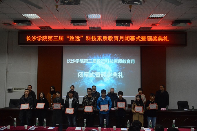 12月7日晚,致远楼学术报告厅内热情高涨。我校第三届“致远”科技素质教育月闭幕式暨颁奖典礼在这里举行。副校长张世英,原国防科技大学教授、我校电信学院创新基地指导老师高吉祥,电信学院院长刘光灿、党总支书记石学兰,校团委副书记尹方园,电信学院副院长刘辉、党总支副书记胡小毅出席闭幕式,电信学院各教研室主任、部分教师代表到场参加。