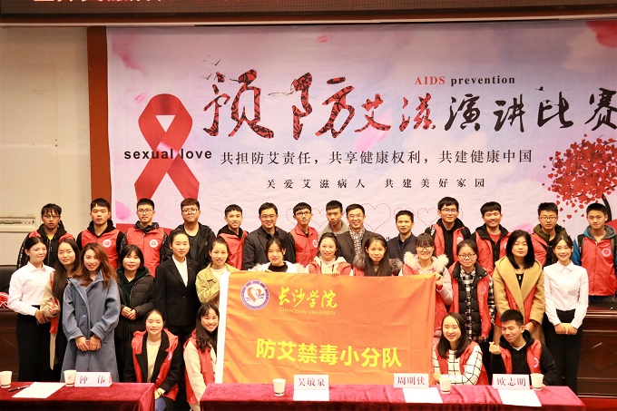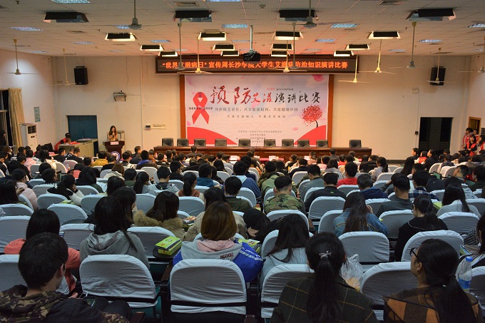 11月24日晚,我校在致远楼学术报告厅举办了一场以“共担防艾责任,共享健康权利,共建健康中国”为主题的大学生预防艾滋病演讲比赛。长沙市卫计委副主任吴敏泉、欧志明,长沙市卫计执法局副局长夏放群,我校副校长周明侠、后勤处处长余文龙等相关领导出席了演讲比赛并担任评委。我校300多名学生到场观看比赛。
