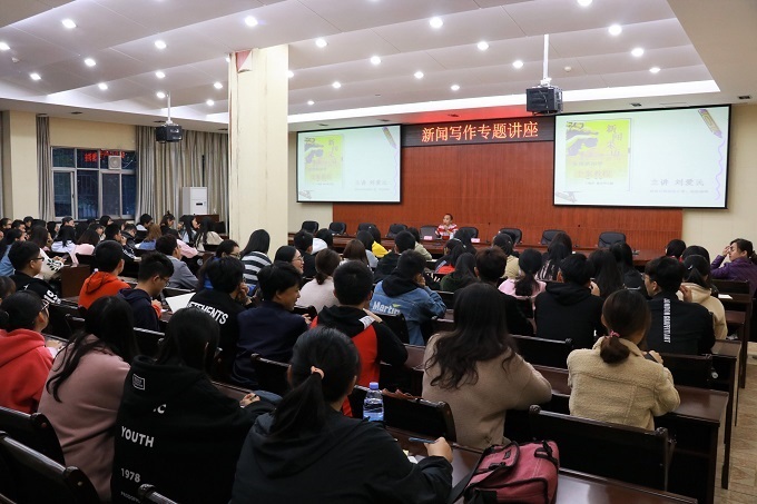 刘爱民以“事实为王—关于新闻报道的把握和选择”为主题,从“新闻的定义”与“价值、事实的把握”两个板块延展,对新闻写作的技巧进行了深入分析。刘教授以诙谐幽默的语言与同学们进行开场互动,通过少年毛泽东创办《救国救亡报》的故事引出《湖南日报》的发展历程,并鼓励学生在学好自身专业的同时,加强新闻写作能力的提升。刘爱民强调,找到事实的最小单元是新闻写作的关键,并引用了《“一分钟洗一次澡”的悲哀》等例子为同学们详细剖析如何寻找新闻事实的最小单元。刘爱民表示,新颖独特的切入点和以大众的视角看问题,寻找新闻点是寻找新闻事实的最小单元的“法宝”。同时,刘爱民以自己对“树葬”事件的报道为例,阐述了新闻写作要打破思维惯性,关注新闻事件本身。