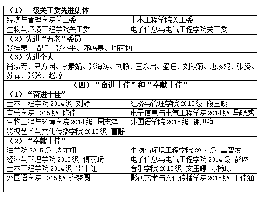 校关工委副主任李云龙宣读了表彰决定。会议对湖南省和学校2016-2017学年度“心无旁骛 求知问学”主题教育活动征文、演讲比赛获奖者、学生“奋进十佳”、“奉献十佳”获得者和2016-2017年度学校关工委工作先进集体和个人进行了表彰。与会领导为获奖师生颁奖。“奋进十佳”获奖者代表、土木工程学院2014级学生刘野分享了自己一路奋进的心路历程,激励在校学生勇敢追梦、奋力拼搏,争做有担当、负责任的奋进青年。