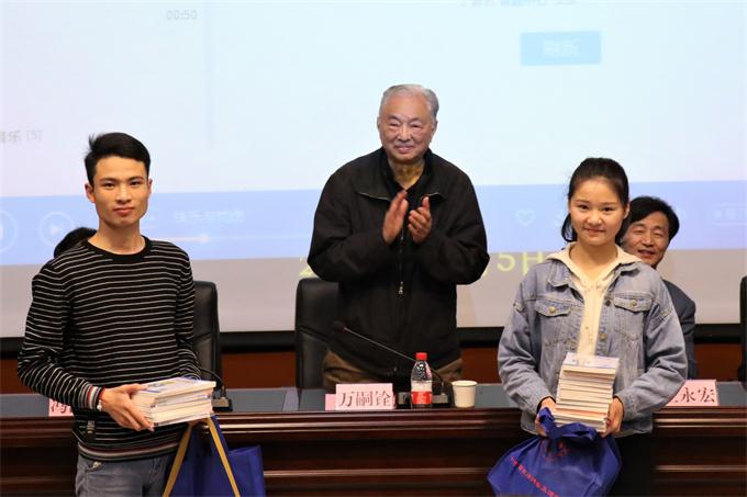 中国桥协特邀顾问、原北京市政协副主席万嗣铨讲话并向我校学生代表赠送桥牌用具