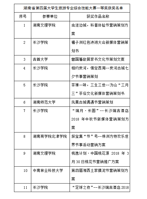 经过一天的紧张角逐,大赛共产生一等奖13个,二等奖19个,三等奖25个,优秀组织奖6个。湖南师范大学、中南林业科技大学、长沙学院等七所高校获一等奖。闭幕式还确定了下一届湖南省大学生旅游专业综合技能大赛由中南林业科技大学涉外学院承办。