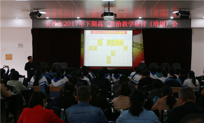 10月18日是中国共产党第十九次全国代表大会胜利召开的日子,长沙大学附属中学(以下简称长大附中)也迎来了长沙市高三政治教学研讨会。长沙市教科院规划所所长袁苍松、长沙市政治名师工作室首席名师张扬、名师黄治清和吴根深及各兄弟学校高三教师170余人参加了此次活动。