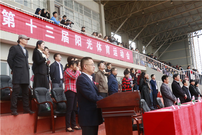 庄严的升旗仪式后,周明侠宣读了本次运动会组委会及仲裁委员会名单。紧接着,运动员代表卫依冰、裁判员代表谭清文分别宣誓。最后,韦成龙宣布我校第十三届阳光体育运动会正式开幕。