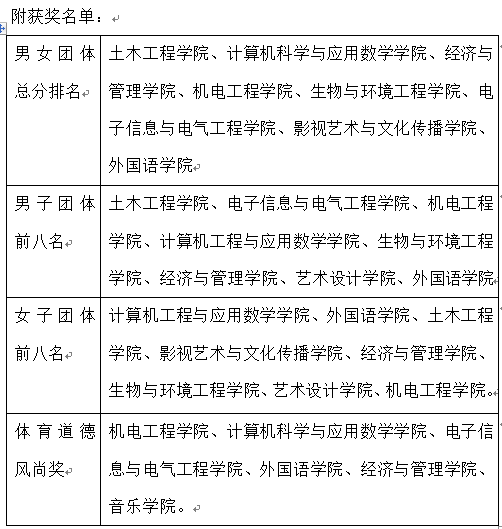 本次运动会历时两天,共设比赛项目31项。其中,男子、女子项目各12项,集体项目7项。我校11个学院代表队共计1095人次参加本次运动会。产生奖牌93枚。其中土木工程学院代表队以287.5分的高分夺得了男女团体总分第一名;计算机工程与应用数学学院巾帼不让须眉,以75分高分获得了女子团体总分第一的好成绩;土木工程学院男运动员们力展土木雄威,以107.5分高分拿下了男子团体总分第一。机电工程学院、电子信息与电气工程学院等6个学院荣获体育道德风尚奖。