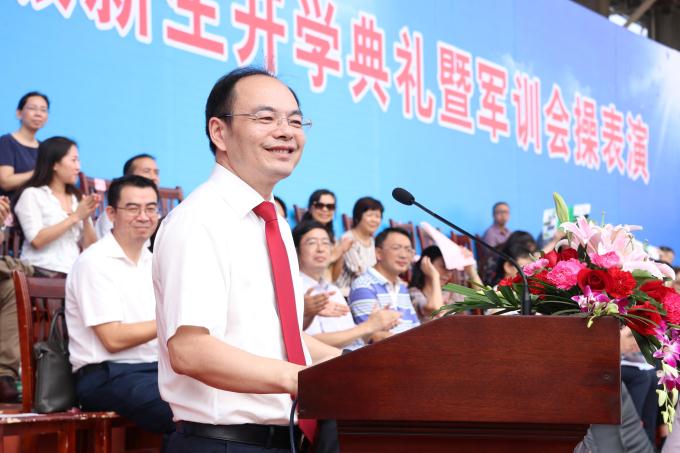 党委副书记、校长杨小云代表学校党委、行政对2017级新同学的到来表示热烈的欢迎,向为同学们实现大学梦想任劳任怨、无私奉献的家长们表示崇高的敬意,对我校军训自训工作给予了充分肯定。他以《从“众”到“人”,做善于思考的大学生》为主题为新生上了开学第一课。杨小云以先贤为例,将独立思考的品质延展,希望每个同学都能清楚认识自己的优势与方向,崇尚真理,尊重科学,独立思考、敢于创新,努力培养自己的创造力与想象力,从附和众人、人云亦云的人转变为独立自主、独立思考的人。最后,杨小云激励全体新生:未来四年,希望你们把远大理想、家国情怀和书生意气汇入到自己的学习与实践中,心忧天下,敢为人先,力学笃行,不负青春!