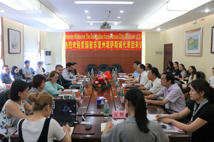 校长杨小云、副校长刘世昌在校办公楼二会议室亲切会见了代表团全体成员。杨小云校长首先对Scott Wagner副市长一行表示热烈的欢迎。美国堪萨斯市与中国长沙市作为友好城市,在地缘、交通、经济发展等方面有着诸多相似之处。UMKC(美国密苏里大学[堪萨斯市] )素有“公立常春藤名校”之称,希望能与UMKC在人才培养、师资培训、学生学习实习以及创新创业等方面开展实质性合作。