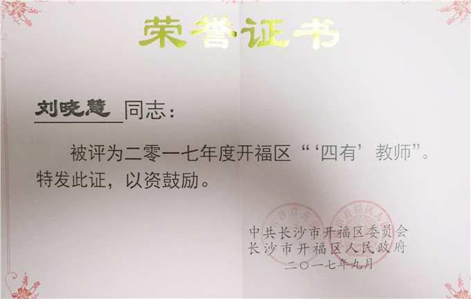会议对在开福区教育工作中涌现出来的先进典型进行了表彰。我校谭梦梅、刘晓慧两位教师分别获得开福区“优秀教育工作者”、“‘四有’教师”光荣称号。