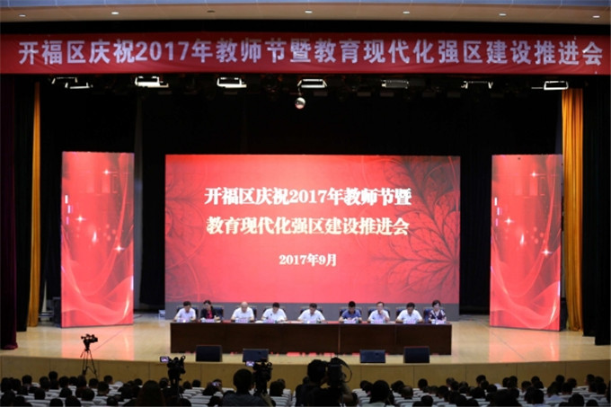 9月7日下午,开福区区委、区政府在青竹湖影剧院举行庆祝2017年教师节暨教育现代化强区建设推进会。会议由开福区委副书记、区人民政府区长刘拥兵主持;开福区委书记沈裕谋在会上作了讲话,对开福教育发展给予了充分肯定,认为开福教育工作可圈可点,教育工作者有为有位,教学质量越来越高。开福区副区长杨光华在会上作了推进教育现代化强区工作报告。长大附中陆佳宾校长出席了会议。