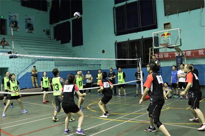 韦成龙宣布比赛开始,随着裁判的一声哨响,比赛迅速进入高潮,各队之间进攻有力,防守严密,配合得当,现场气氛持续上涨。经过一天的小组循环赛后,计数学院、继教学院、外语学院等8支队伍进入复赛。27日晚,8支队伍重聚永康体育馆,通过抽签进行两两对抗,获胜的队伍进入最后的冠亚季军争夺赛。急速发球、低位救球、跃起拦截、奋力扣杀,各队队员之间默契十足。漂亮的进攻、快攻、后排攻、快球等战术球点燃观众的激情,场上场下鼓掌声、欢呼声一浪高过一浪。
