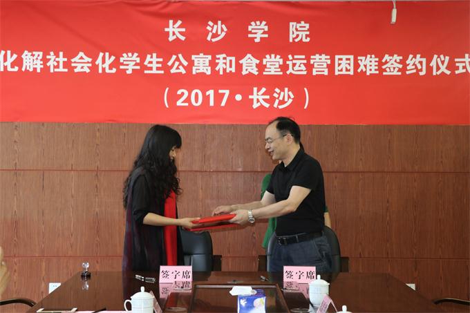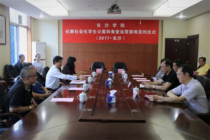 6月16日上午,我校在一办公楼二会议室举行了简短的化解社会化学生公寓和学生食堂运营困难签约仪式。校长杨小云与湖南维智教育投资发展有限公司(简称维智公司)授权代表李兵、熊晓玲签署了《长沙大学学生公寓、学生食堂及配套设施项目合作合同》解除协议,与长沙弘昱投资有限公司(简称弘昱公司)法人代表陈志宏签署了《长沙学院第三期学生公寓、学生食堂及配套设施项目合作合同》解除协议的补充协议。长沙学院校长杨小云,副校长王永宏、纪委书记杨兴龙,维智公司、弘昱公司相关负责人出席了签约仪式。我校化解工作领导小组部门主要负责人参加了签约仪式。副校长王永宏主持签约仪式。