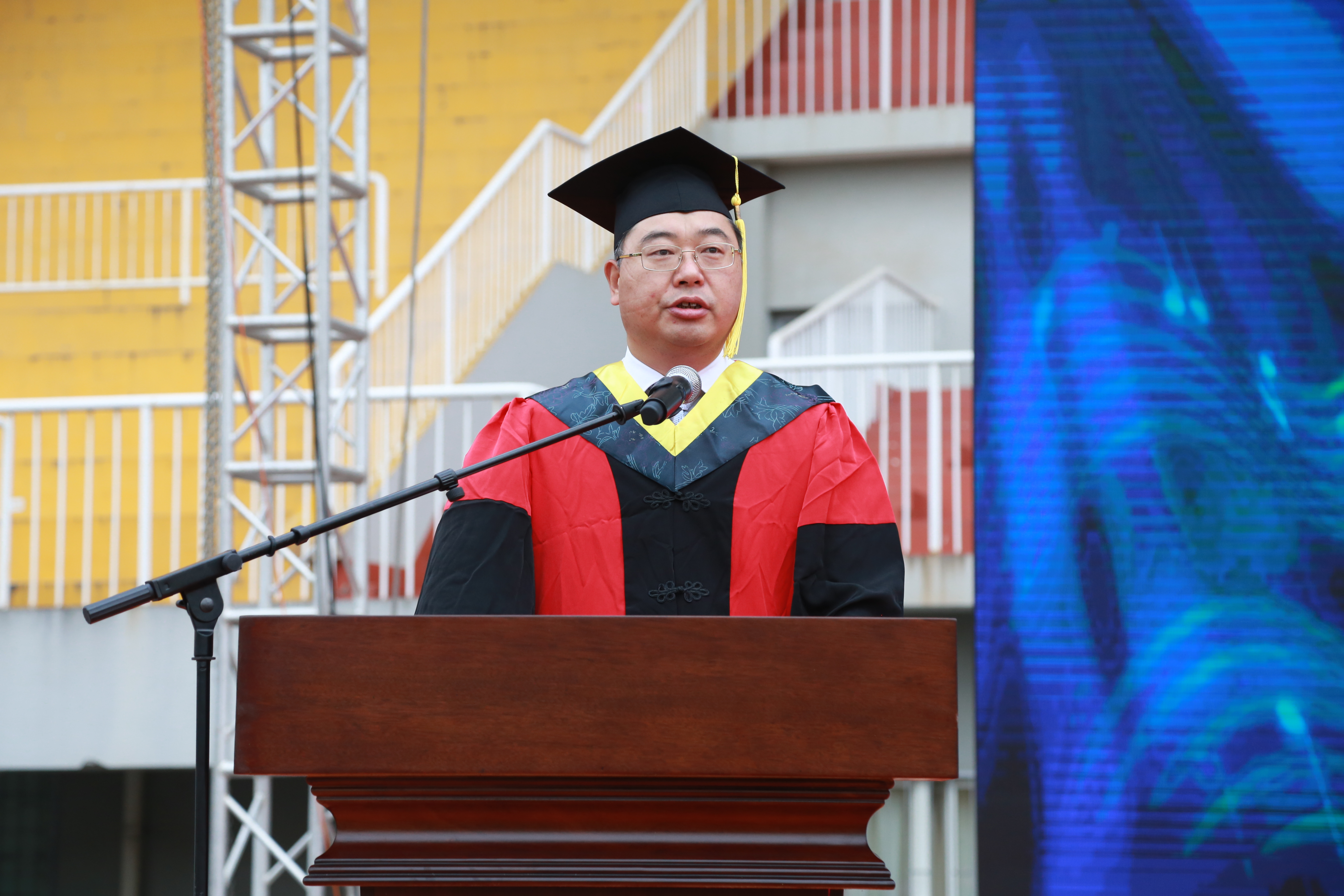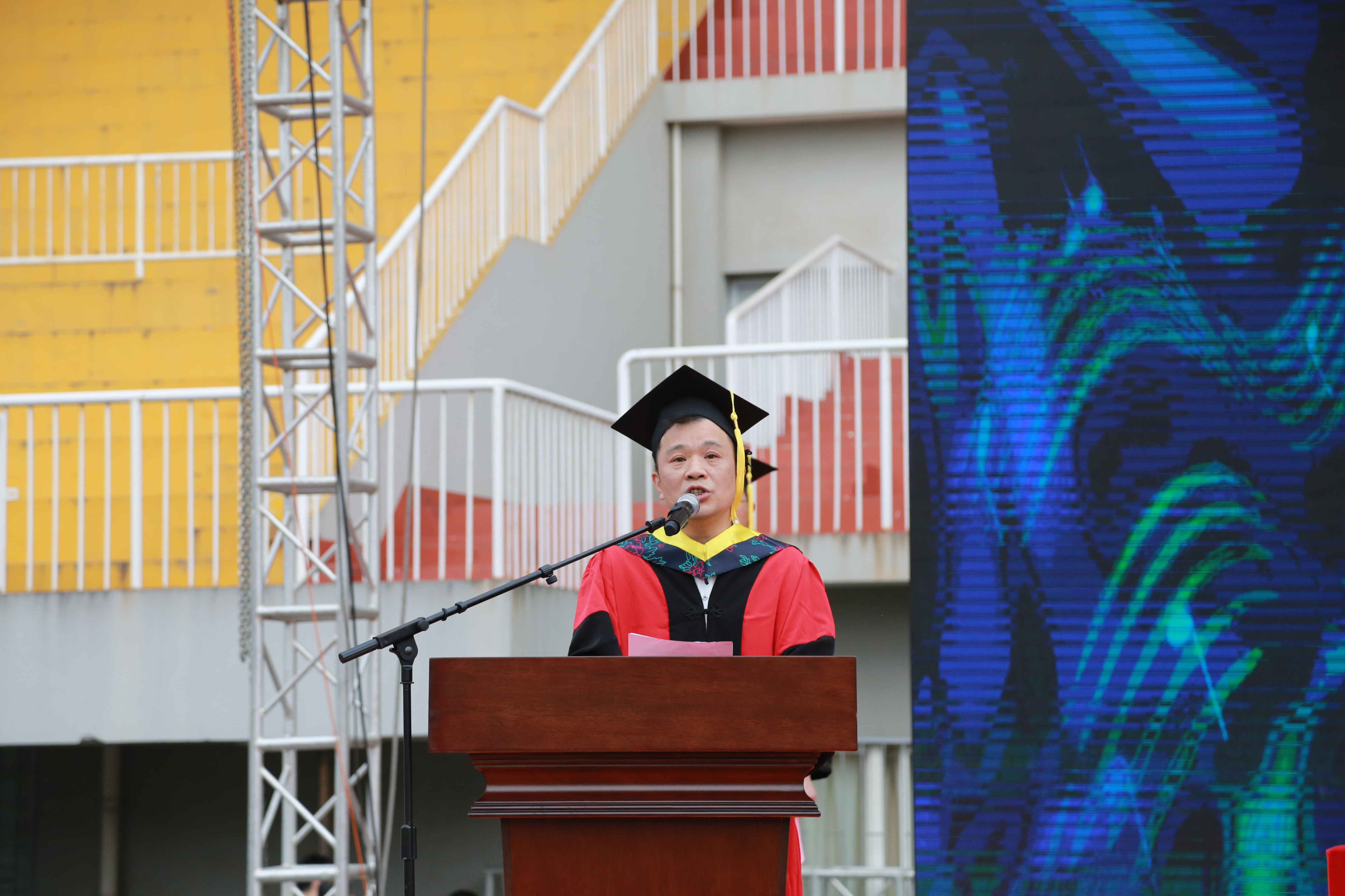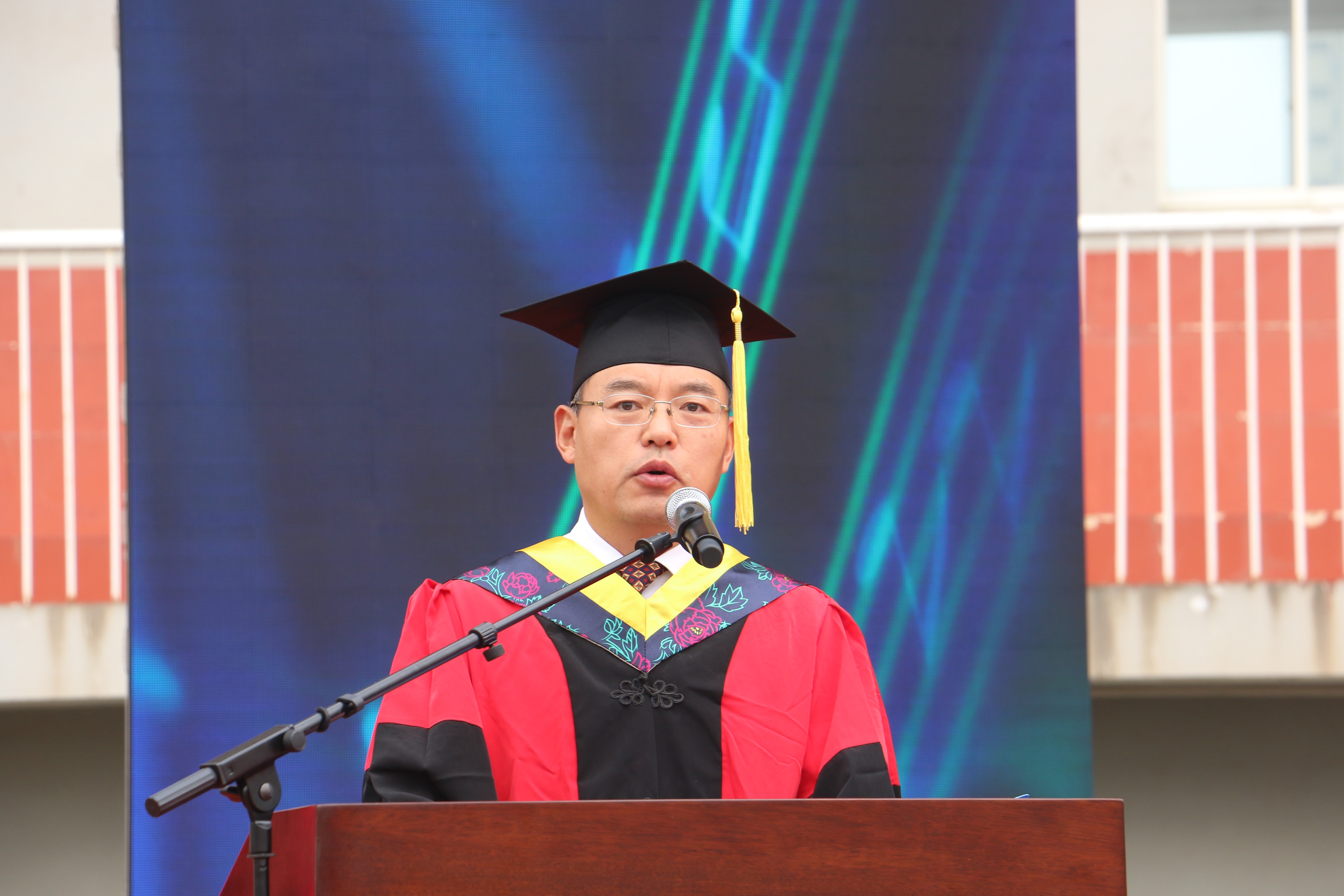 党委副书记、校长杨小云发表了热情洋溢的讲话。他代表学校对圆满完成学业并即将开启人生新征程的毕业生们表示真挚祝贺,并向执鞭杏坛、辛勤耕耘的老师们表达衷心感谢。他指出,“崇德、实干、担当”六字,是长大内在的文化基因,是长大的精神长相,是长大学子独一无二的精神名片。杨小云简要介绍了学校近两年的获奖情况及考研成果,肯定了长大学子们脚踏实地、顽强拼搏的实干精神。他还高度赞扬了我校2017届毕业生中的11位勇于担当、心怀大爱的援藏、援疆优秀毕业生,“在他们身上体现出‘苟利国家生死以,岂因祸福避趋之’、哪里需要就去哪里的强烈家国情怀和社会责任感,令人动容”。长大是长大莘莘学子的精神家园,杨小云希望所有长大学子都能植根长大沃土,不忘初心、苦干实干、勇于担当,把长大精神发扬光大,书写出雄壮的生命乐章。