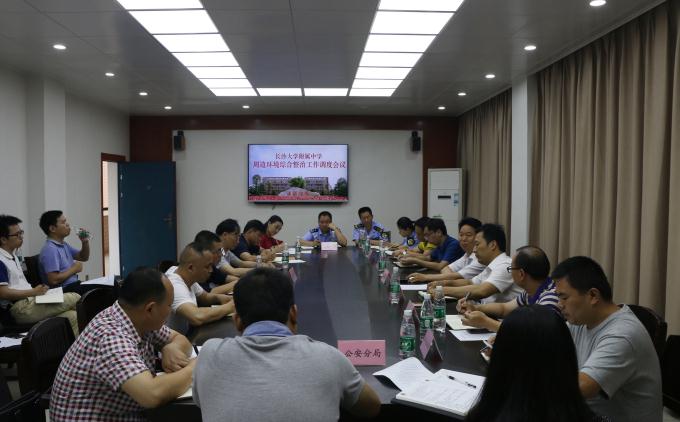 调度会在长大附中办公楼会议室进行,校长陆佳宾、党委书记刘孟佳、副校长刘新文、保卫处主任李章红出席了会议。会上,陆佳宾校长简单介绍了学校情况,就如何进一步加强学校周边综合治理和创新推进大开福教育提出了一些具体思路;刘新文副校长就校园周边流动摊贩、食品安全、交通设施、公交站设置、治安环境、车辆随意停放等综治现状作了详细介绍,提出了整治诉求。开福区各职能部门就如何解决学校反映的各项问题作表态发言,并与学校进行了可行性分析和磋商。两位副区长对长大附中周边流动摊贩整治、社会治安以及交通优化等问题做了具体部署,要求相关部门提高认识,明确责任,强化举措,确保效果,表示区政府仍将一如既往地支持长大附中的建设和发展。