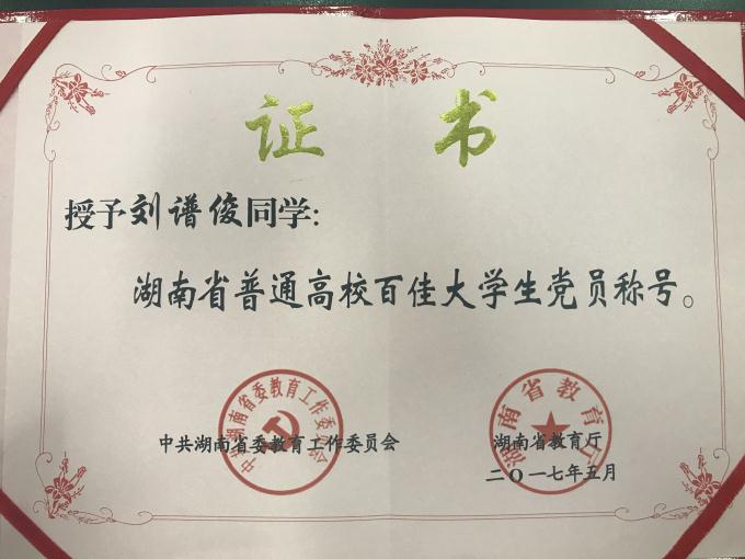 近日,接湖南省委教育工作委员会、湖南省教育厅《关于表彰湖南省普通高校百佳大学生党员的通报》,我校机电工程学院刘谱俊、影视艺术与文化传播学院赵梦婵两名同学获2017年度“湖南省普通高校百佳大学生党员”荣誉称号。