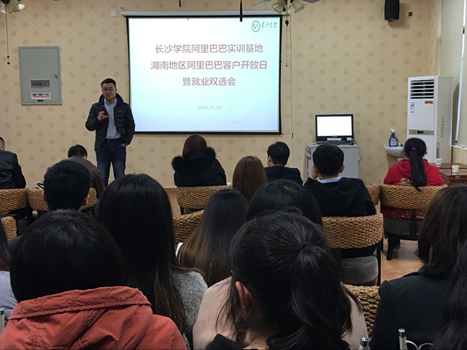2016年11月22日下午,由阿里巴巴湖南分公司、长沙跨境人才培养基地、长沙学院跨境电商工作室共同举办的长沙学院跨境电商实训基地阿里企业开放日暨就业双选会在综二楼401室进行。来自湖南老木坊贸易有限公司等10家湖南区域的阿里巴巴客户共23位企业代表参与会议。活动分为工作室介绍、平台分析、第三方交流和人才双选四个环节。