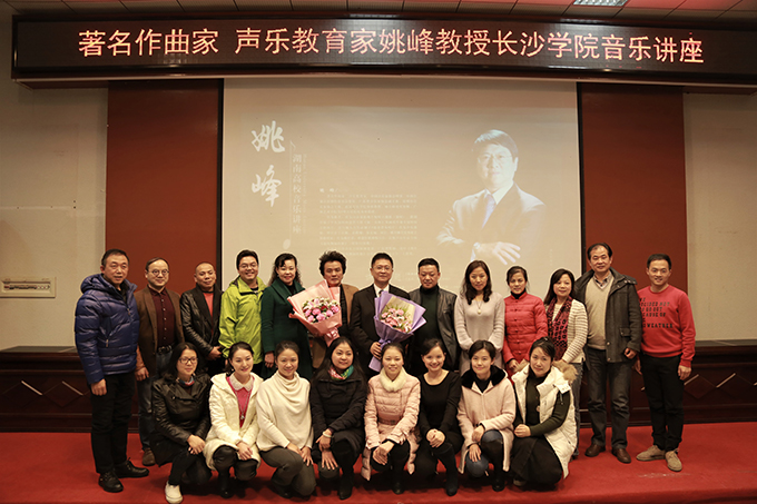 11月23日晚,著名作曲家、声乐教育家、歌唱家姚峰在我校学术报告厅举行音乐讲座,男高音歌唱家、国家一级演员张天甫陪同参加。此次讲座由我校教务处主办,音乐系公共艺术教研室承办,长沙各高校声乐教师及我校部分学生到场聆听。讲座由音乐系主任刘淮保主持。