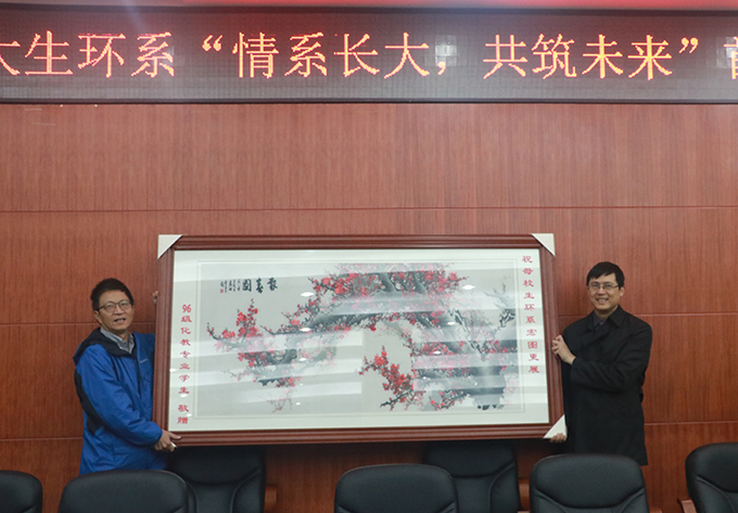 正院级督导郭清泉代表生环系接受96级化教9班赠送的精美湘绣