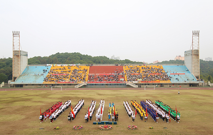 伴随慷慨激昂的《运动员进行曲》,来自各系部的十一个方阵和裁判员方阵队依次缓缓走过主席台。首先出场的中影系在往年“放飞气球、放飞梦想”的创意基础上新增“倒计时”创意,赢得了现场的阵阵掌声与欢呼声。紧接着出场的土建系在通过主席台时以队列拼成洪山桥的形状得到了观众的一致好评。