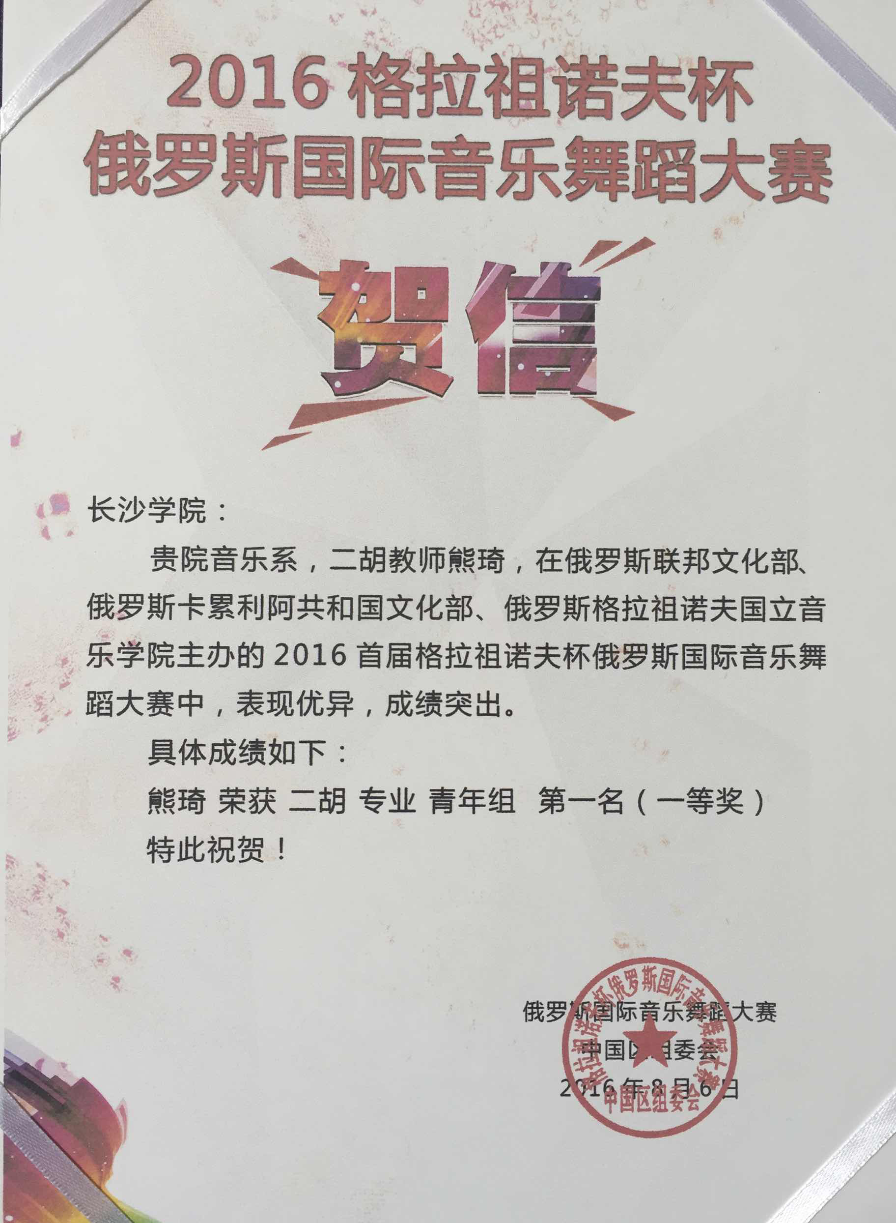 2016年8月1日--8月2日,由俄罗斯联邦文化部、俄罗斯卡累利阿共和国文化部、俄罗斯格拉组诺夫国立音乐学院主办的2016首届格拉组诺夫杯俄罗斯国际音乐舞蹈大赛总决赛在俄罗斯联邦卡累利阿共和国国家大剧院举行,我校音乐系二胡教师熊琦参加了比赛并荣获民族器乐组一等奖。