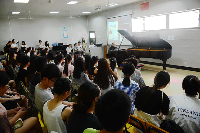 迈克先生通过演示巴洛克时期、浪漫时期和现代派的钢琴曲作为讲座的开端,在生动地展示不同音乐风格的同时,提出本场教学的核心问题:音乐是由什么材料构成的?这个问题引起了在座师生们的热烈讨论。迈克先生用瓦格纳和巴赫的乐曲作答并做出解释:构成音乐的材料是——“时间”。