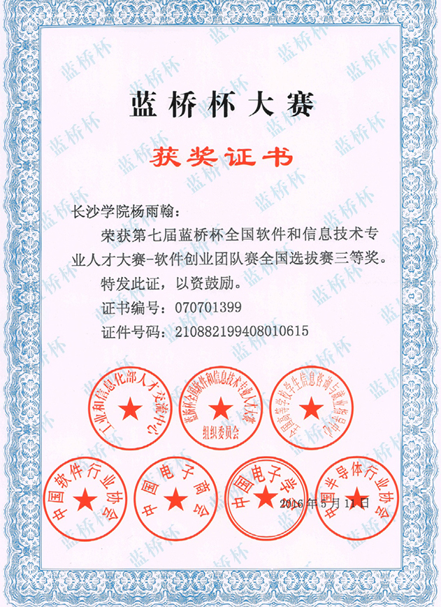 13级通信工程专业杨雨翰及其团队获奖证书