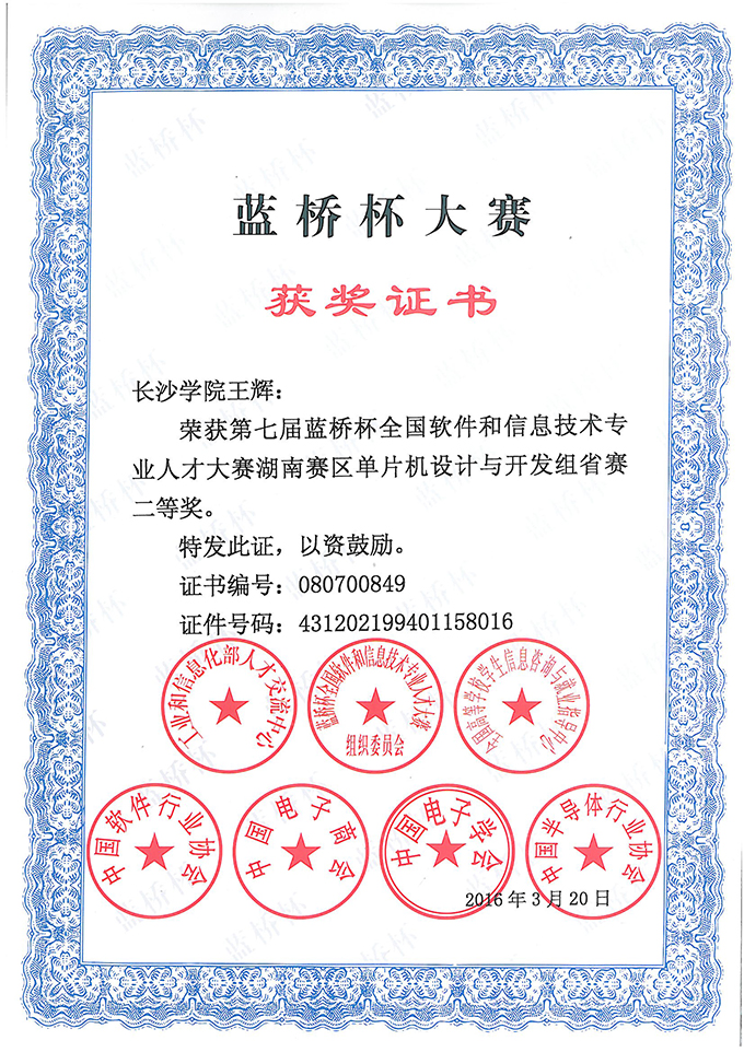 12级电子信息工程专业王辉同学获奖证书