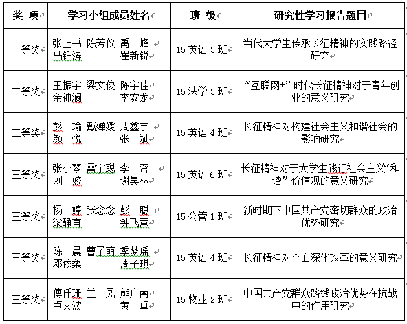 从2015级各专业班级经过初赛、复赛选拔出来的七组选手进入到最后决赛。参赛选手围绕“长征精神的当代价值研究”和“中国共产党的政治优势研究”两个主题对《中国近现代史纲要》课程的研究性学习成果以PPT形式进行了展示汇报。比赛最终决出一等奖1组、二等奖2组、三等奖4组。至此,我校历时2月有余的第二届大学生思想政治理论课研究性学习成果展示竞赛活动落下帷幕。