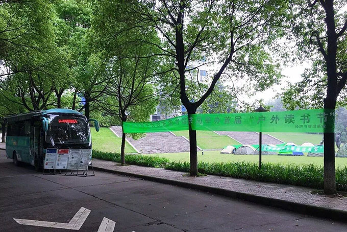 为响应省委省政府“倡导全民阅读,共建文明湖南”的号召,长沙学院经济与管理系在2016年伊始和长沙市图书馆合作开启“读书工程”建设,长沙学院作为此次“书香湖南•湘江阅读季”主题活动的分会场,除举办“读书分享会”活动外,经管系还于4月27-28日在校园内开展“户外读书节”活动。27-28日,在长沙学院图书馆前坪举办“户外帐篷读书节”,学生们在帐篷内闻着绿草清香,与书为伴;同时, 27日上午,长沙市图书馆流动图书室进驻长沙学院,现场为学生提供办理长沙市图书馆借书证服务并提供3000余本书籍供学生借阅。