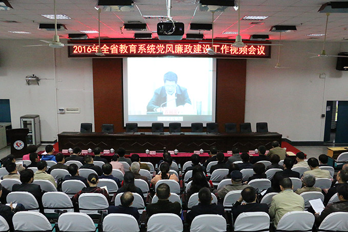 4月26日上午,2016年全省教育系统党风廉政建设工作视频会议召开。按照省教育厅的要求,我校全体校领导,各系部主要负责同志,各部门主要负责人,附属中学主要负责同志,纪委办、监察处全体同志在学校致远楼学术报告厅视频会议分会场参加了会议。会上,省教育厅党组书记、厅长、省委教育工委书记肖国安同志讲话,省教育厅党组成员、省委教育工委委员陈飞跃作工作报告,会议由省教育厅党组成员、副厅长、省委教育工委委员葛建中同志主持。