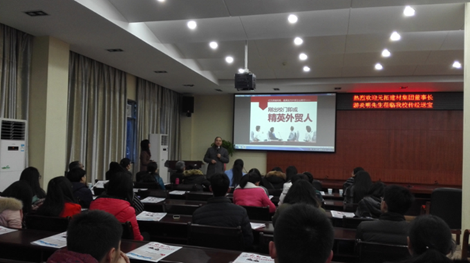 2016年1月8日上午,元拓集团董事长、湖北商会会长游炎明在校图书馆会议室为我校师生作了题为“外贸,成长——成就他人”的主题宣讲。元拓集团商学院院长郭岳梅,经济与管理系主任李映辉、系副主任曾广录,阿里巴巴跨境电商培训班讲师团队、部分教师及百余名学生出席此次活动。宣讲会由李映辉主持。