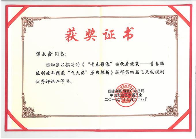 2015年12月28日,由我校中文与影视传播系谭文鑫博士、张吕教授撰写的《"青春影像"的执著蜕变--青春偶像剧近年频获"飞天奖"原因探析》获得第四届飞天电视剧优秀评论二等奖。这是我校广播电视领域艺术硕士重点建设点建设的又一次突破。