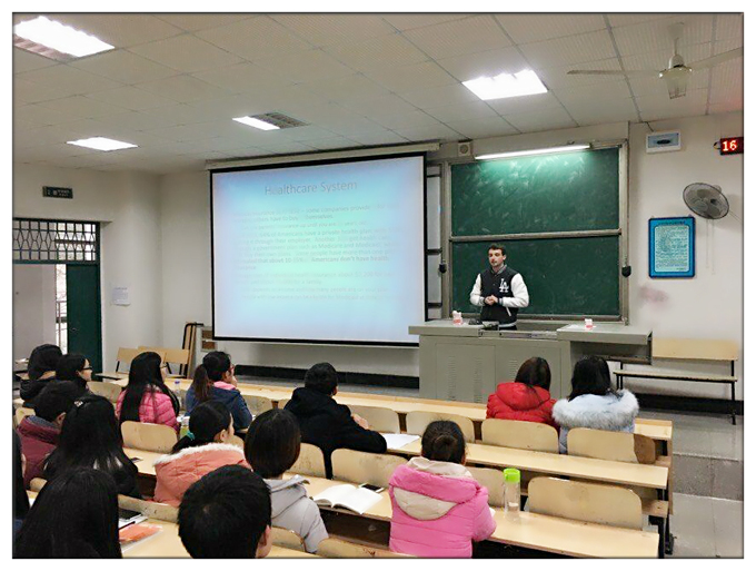 12月9日下午,美国外教Jesse Kerevens第二次做客经管系《跨文化交际》课堂,在涵虚楼B多3多媒体教室与2013级物业管理专业学生交流"中西方医疗健康与饮食文化差异"。