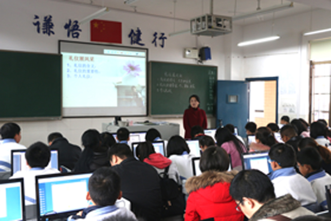 第二节观摩课由骨干教师郭礼老师执教。郭老师执教的内容是初二年级教材《礼仪展风采》。知性、优雅的郭老师亲身示范,循循善诱,充分利用学校101网络教学平台,将学生课前预习情况与课堂反馈内容及时呈现于课堂教学中。郭老师将自拍视频、网络资源、学科软件等信息技术手段灵活运用于课堂教学中,向兄弟学校同仁展示了附中信息技术建设与学科教学有效融合的成果。