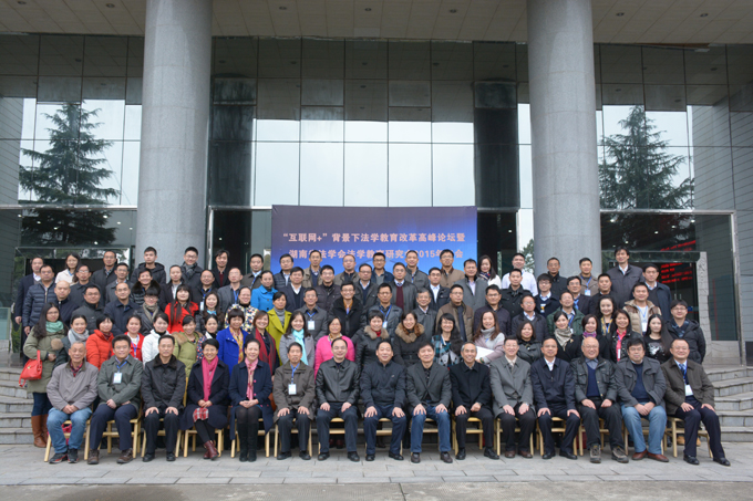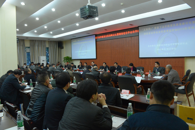12月6日,"互联网+"背景下法学教育改革高峰论坛暨湖南省法学会法学教育研究会2015年年会在我校召开。来自湖南省法学会法学教育研究会、广东省法学会法学教育研究会、湖南省内三十余所高校法学院系、高等教育出版社、中国人民大学出版社、知识产权出版社、长沙市开福区人民法院的领导及专家学者百余人参会。开幕式由湖南省法学会法学教育研究会副会长、博士生导师李爱年教授与长沙学院副院长屈林岩教授主持。长沙学院院长、博士生导师杨小云教授,湖南省政法委副巡视员、省法学会副会长兼秘书长周小华,长沙市委政法委副书记、市法学会常务副会长梁粮及湖南省法学会法学教育研究会会长、博士生导师刘定华教授在开幕式上先后致辞。杨小云院长代表学校师生向与会的专家学者、与会嘉宾表示衷心的感谢和热烈的欢迎,并介绍了学校概况和我校法学学科教育的现状,肯定了本次年会主题和强调了新时代科技发展对我们生存方式、教育方式、人才培养模式的深刻改变。他希望本次年会能够加深我校和湖南省各大高校的交流与合作,与会专家学者能够一如既往地支持和帮助长沙学院政法系在法学教育领域的工作,特别是"互联网+"背景下的法学教育改革试点工作,一同促进我校法学教育再上一个新的台阶。中南大学法学院院长、博士生导师陈云良教授,湖南大学法学院院长、博士生导师屈茂辉教授、长沙市委政法委研究室主任兼市法学会秘书长尹海阔、《湖南法学》编辑部主任李湘勇等领导和专家出席了开幕式。