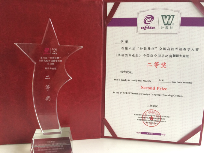 第六届"外教社杯"全国高校外语教学大赛(翻译类专业组)比赛于6月底启动,历时近半年,全国29个省市、自治区相继组织了分赛区的选拔赛、复赛和决赛。李玺作为湖南省赛区第一名参加了全国决赛,作为全国前六强进入总决赛。