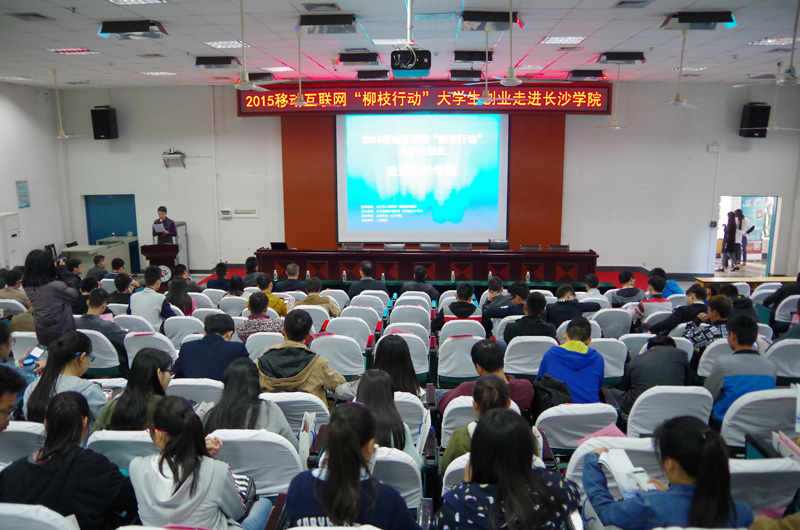 11月3日下午,由长沙高新区管理委员会、共青团长沙市委主办,长沙移动互联网产业联盟、湖南众创科技发展有限公司承办的2015移动互联网"柳枝行动"大学生创业巡讲会在致远楼学术报告厅举行。我校团委书记徐远超、副书记张镇,京八信息科技有限公司总经理、"柳枝行动"特邀嘉宾李宇,湖南众创科技发展有限公司总经理助理冯程出席了巡讲会。