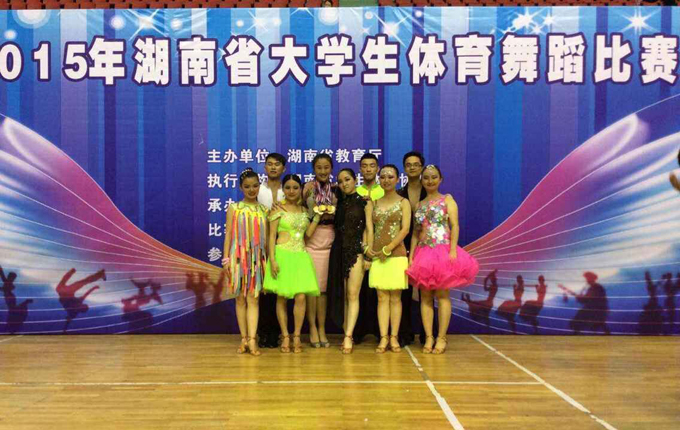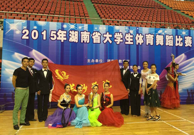 7月4日至5日,由湖南省教育厅主办的2015年湖南全省大学生体育舞蹈比赛在湖南涉外经济学院举行,比赛分为大学专业组、大学普通组、学院专业组、学院普通组、高职专科组、高职专科专业组六个组别。全省共有14所高校、257名运动员参与国际标准舞、健身交谊舞两大类及集体项目的角逐。我校16名队员在领队邓晖教授,教练员谭实、成黎老师的带领下,参加了学院普通组的拉丁舞及摩登舞的比赛,获得3金、2银、10铜、6个第四名、3个第五名及学院组团体总分第二名的好成绩。