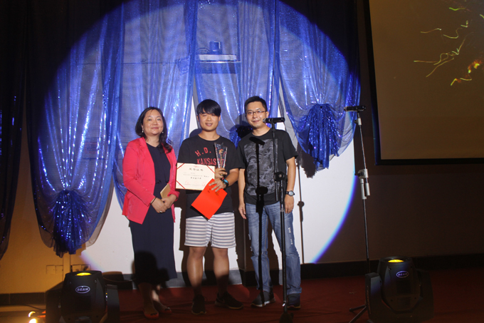 大赛评委湖南省音乐家协会副主席喻秋兰(左一)湖南省红网节目部主任卢晓辉(右一)与"最佳影片获得奖"《金鱼》导演熊丰同学(中)合影