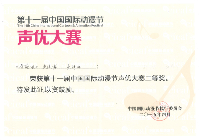 近日,第十一届中国国际动漫节声优大赛总决赛在杭州浙江传媒学院圆满落幕。我校首次参加此类比赛并获得不俗成绩。由中文与影视传播系副主任荣斌老师指导、史俊博(13航空班)和朱诗语(11播音2班)组成的"奇葩组"荣获大赛二等奖。我校中文与影视传播系选送的另外三支团队都顺利进入百强并获得优秀奖。荣斌老师获得最佳指导教师奖。我校获得优秀组织奖。