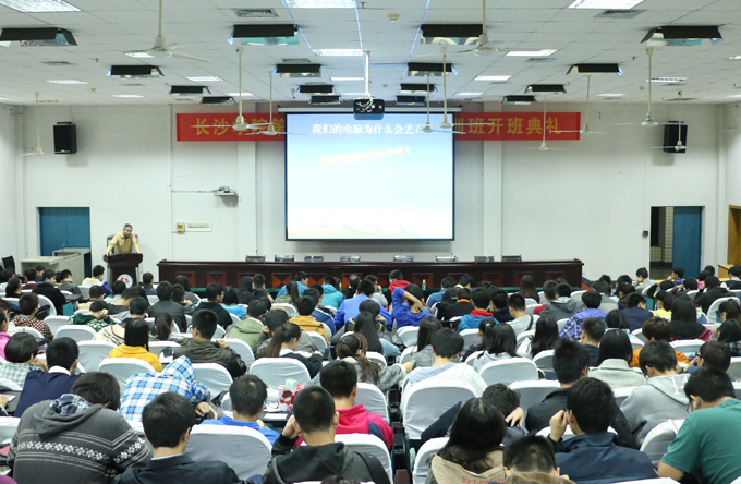 任宙老师给在场师生讲解消防安全知识。他通过列举高校发生安全事故,提醒学生必须重视消防安全。他反复申明消防安全应以预防为主,防消结合,并通过视频教学教在场师生使用各种消防器械。最后,任宙老师还组织在场师生做了消防演练。