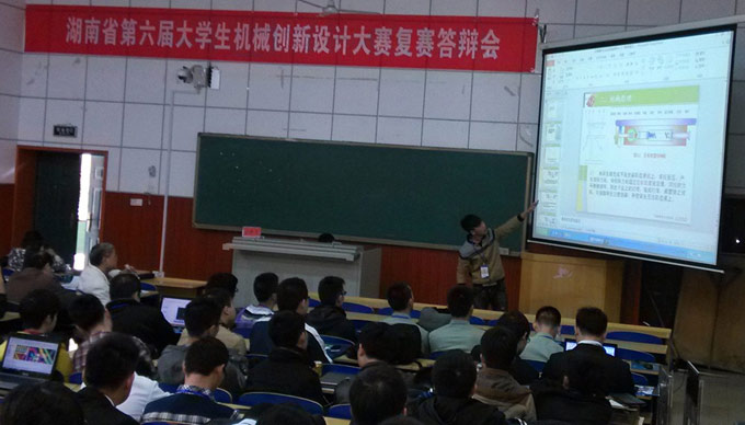 第六届全国大学生机械创新设计大赛主题为"幻▪梦课堂";内容为"教室用设备和教具的设计与制作"。学生们可根据对日常课堂教学情况的观察,或根据对未来若干年以后课堂教学环境和状态的设想,设计并制作出能够使课堂教学更加丰富、更具吸引力的机械装置。本次湖南赛区比赛由湖南省教育厅主办,湖南文理学院承办。我校机电学子与来自国防科学技术大学、中南大学、湖南大学等全省28所高校的190余支参赛队伍同台竞技。