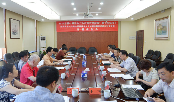 6月11日下午,由我校詹小平书记主持的2014年省社科基金"为改革攻坚献策"重大招标项目《湖南省进一步健全促进就业创业体制机制的思路和对策研究》开题报告会在办公楼二会议室举行。